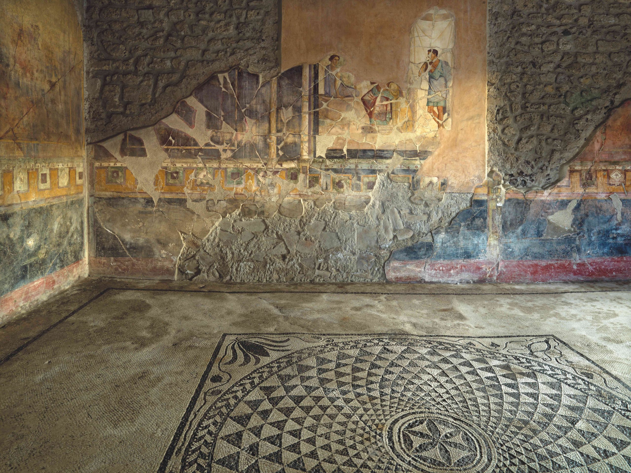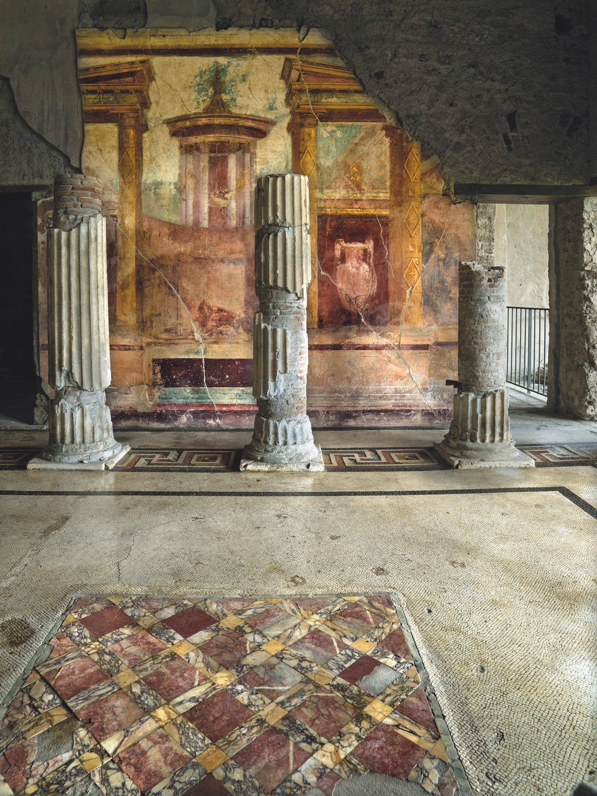 Osservando da vicino i mosaici, percorrendo peristili, riscoprendo ogni particolare delle pitture parietali, Spina ha poi selezionato sessanta interni: fotografie dove le domus riemergono in una visione inedita, in un equilibrio ambientale che restituisce da una parte la dimensione della presenza umana, dall’altra la vastità dell’Impero romano, rievocando allo stesso tempo l’antica tragedia di Pompei.