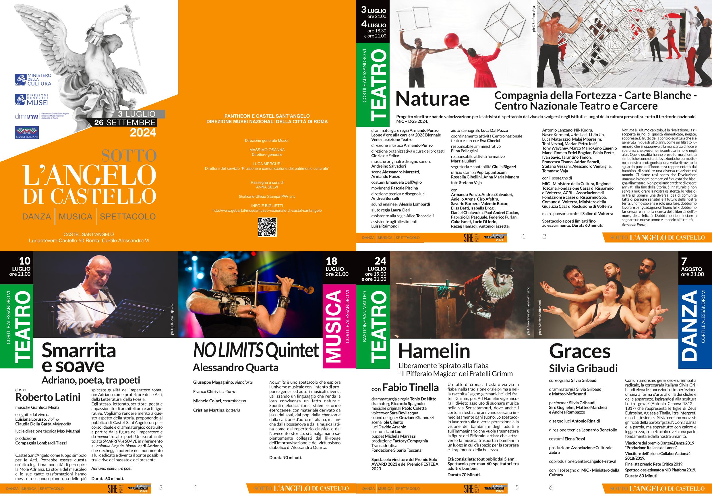 Il confronto fra l’arte dell’attore, quella del danzatore e del musicista, che riesce a innescare un dialogo con gli spazi del museo e i suoi pubblici, è la proposta che Castel Sant’Angelo, guidato dal Direttore generale Musei Massimo Osanna, promuove con la IV edizione della rassegna “sotto l’Angelo di Castello: danza, musica, spettacolo”, a cura di Anna Selvi, che si terrà dal 3 luglio al 26 settembre 2024, nell’ambito del programma di valorizzazione del monumento.