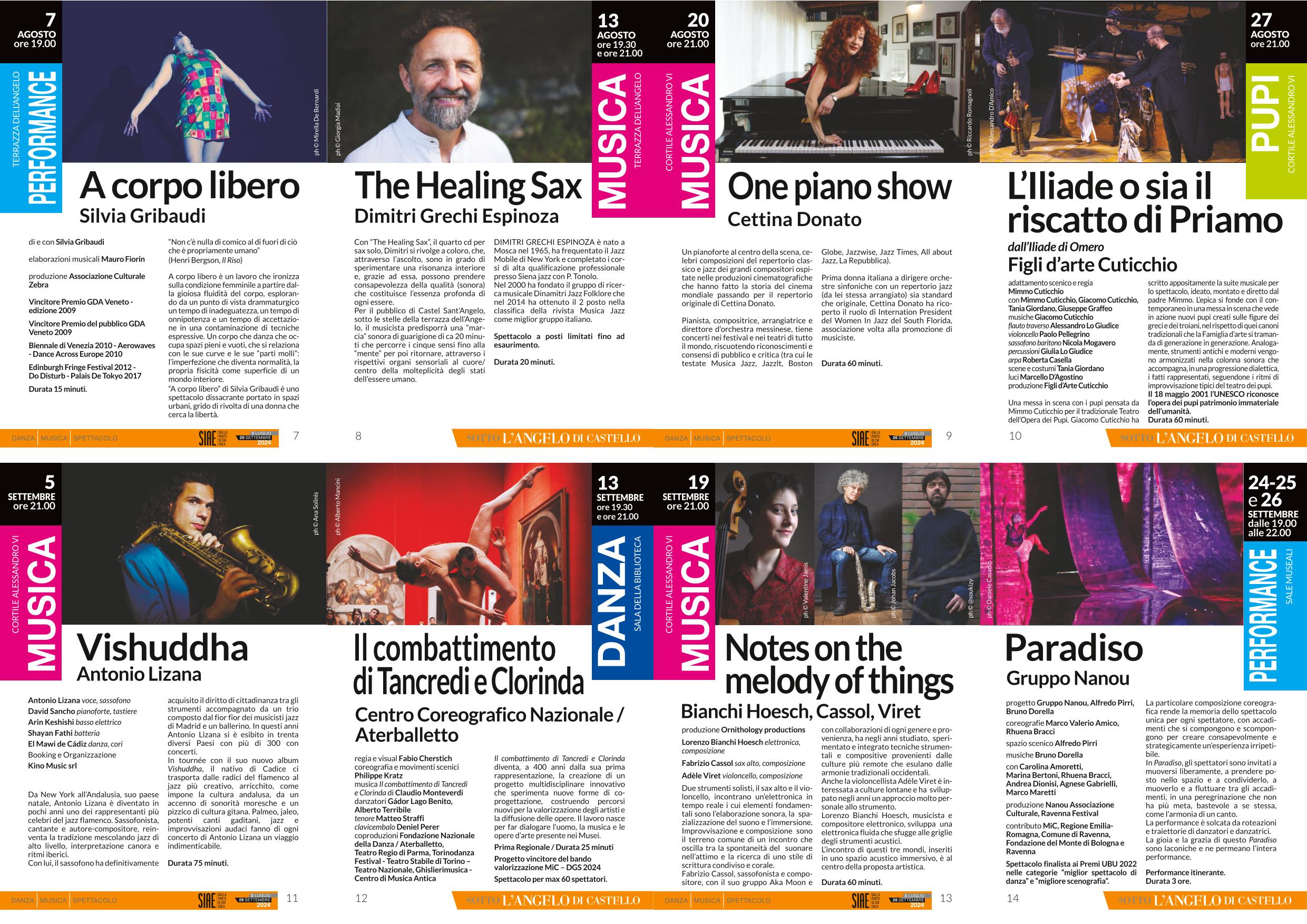 Tutti gli spettacoli si svolgeranno alle ore 21 nel Cortile Alessandro VI, ad eccezione di A Corpo libero e The Haeling Sax che si terranno sulla terrazza di San Michele, Hamelin al Bastione San Matteo, Il Combattimento di Tancredi e Clorinda nella Sala della Biblioteca. Paradiso performance itinerante nelle Sale museali.